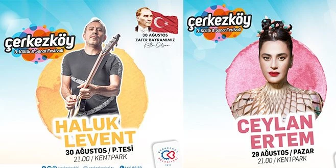 Çerkezköy Belediyesi 3. Kültür ve Sanat Festivali yarın başlıyor. 28-29 ve 30 Ağustos tarihlerinde yapılacak Çerkezköy Belediyesi 3. Kültür ve Sanat Festivali?nde Bisiklet Şenliği, Uçurtma Şenliği ve Streetball Turnuvası gibi renkli etkinliklerin yanı sıra 29 Ağustos Pazar günü Ceylan Ertem, 30 Ağustos Zafer Bayramı?nda ise ünlü sanatçı Haluk Levent sahne alacak.