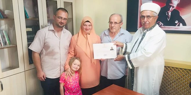 İlçe Müftüsü Menderes Karapunar, İslamı seçen ve Müslüman olan Leyla Gülşen`e hayırlı, mutlu bir yaşam dileklerini iletirken, merasim sonunda `İhtida Belgesi` Müslüman olma belgesini takdim etti.