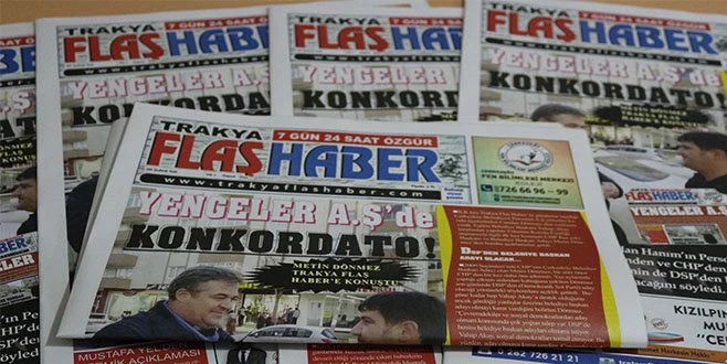 Trakya Flaş Haberin 6. sayısı bugün çıktı. Manşette, ?Yengeler A.ş?de Konkordato!? başlığı ile okuyucuyla buluşan yeni sayımız da bu hafta ,CHP?nin eski  Çerkezköy İlçe Başkanlarından Metin Dönmez?in çarpıcı açıklamalarına yer verilirken,2. sayfa da ise son zamanlarda iptal edilip edilmediği tartışma konusu olan Termik Santralle ilgili Ak Parti Tekirdağ Milletvekili Mustafa Yel?in açıklamalarına ??ÇED süreci devam ediyor?? başlıklı haberde  yer verildi.