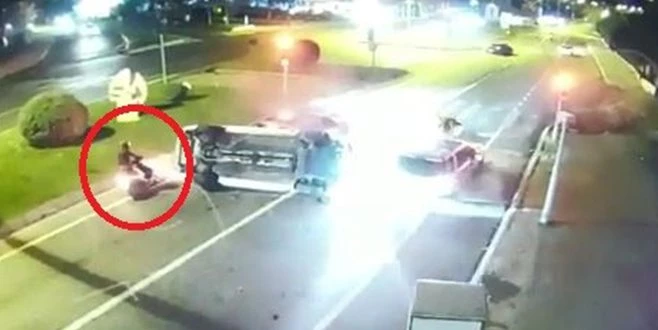 Kırımızı ışıkta bekleyen 2 araca çarpmanın etkisi ile takla atan araç, devrildiği sırada ışıkta bekleyen bir motosikletlinin üzerine doğru düştü. Takla atan araç düştüğü sırada motosikletinin üzerinde bulunan sürücü küçük bir hamle ile üzerine devrilen aracın altında ezilmekten son anda kurtuldu.