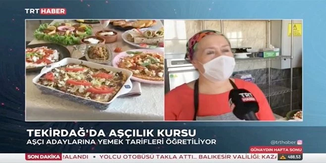 Ergene Belediyesi?nin kadınların meslek sahibi olarak iş hayatına katılması ve aile ekonomileri başta olmak üzere ülke ekonomisine katkı sunabilmeleri adına düzenlediği kurslar arasında yer alan Aşçı Çıraklığı kursuna katılan kursiyerlerin kurs öğreticisi şef Gülbin Pekel nezaretinde öğrendikleri tariflerle bayat ekmekleri kullanarak yaptıkları yemekler TRT Haber ekranlarında yer aldı.