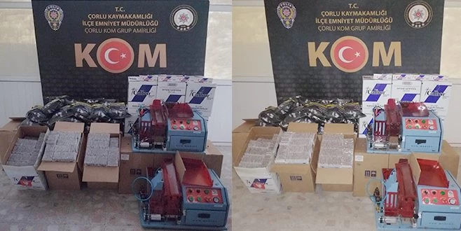 Tekirdağ İl Emniyet Müdürlüğü Kaçakçılık ve Organize Suçlarla Mücadele Şube Çorlu Kom Grup Amirliği ekiplerince kaçak tütün ve tütün ürünlerine yönelik çalışma yapıldı. Çorlu ilçesinde Kaçakçılık Suçlarıyla Mücadele kapsamında açık kıyılmış tütün ve içi kıyılmış tütün ile doldurulmuş makaron satışı yaptığı değerlendirilen işyerinde yapılan aramalarda, 214 bin 100 adet boş makaron, 38 bin 820 adet içi tütünle doldurulmuş makaron, 139 kilogram paketli ve açık kıyılmış tütün, 42 adet kesilerek mükerrer kullanılacağı değerlendirilen bandrol, 2 adet makaron doldurma makinası, 1 adet kompresör, 1 adet hava kurutma makinası ele geçirildi.