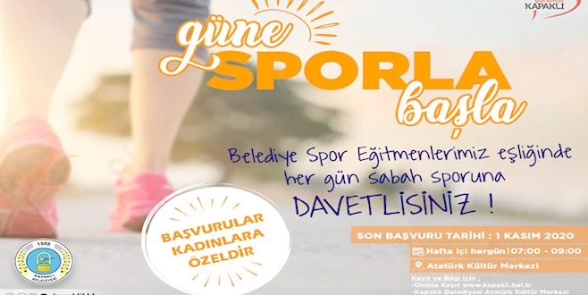 Başvuruların 1 Kasım 2020 tarihine kadar süreceği etkinlik hafta içi her gün 08.00 ile 10.00 saatleri arasında spor eğitmenleri eşliğinde Kapaklı Atatürk Kültür Merkezi?nde gerçekleştirilecek. Konuyla ilgili Kapaklı Belediyesi Gençlik ve Spor Hizmetleri Müdürlüğü?nden yapılan açıklamada, ?Kadınlarımızın güne pozitif başlamaları, günlük yaşamın stresinden arınıp, daha hareketli olmaları, beden ve ruh sağlıklarının korunmasına katkı sağlamak amacıyla spor eğitmenlerimiz eşliğinde hafta içi her gün 08.00 ile 10.00 saatleri arasında sabah sporu etkinliği düzenleyeceğiz. Atatürk Kültür Merkezi?nde ücretsiz olarak yapılacak etkinliğe katılmak isteyen kadınlarımız www.kapakli.bel.tr üzerinden online olarak veya Atatürk Kültür Merkezi?nde bulunan Gençlik ve Spor Hizmetleri Müdürlüğü?nden şahsen gelerek kayıt olup, bilgi alabilirler.? denildi.