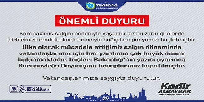 "Koronavirüs salgını nedeniyle yaşadığımız bu zorlu günlerde birbirimize destek olmak amacıyla bağış kampanyamızı başlamıştık. Ülke olarak mücadele ettiğimiz salgın döneminde vatandaşlarımız için her yardımın çok büyük önemi bulunmaktadır. İcişleri Bakanlığı`nın yazısı uyarınca Koronavirüs Dayanışma hesaplarımız kapatılmıştır. Vatandaşlarımıza saygıyla duyurulur."