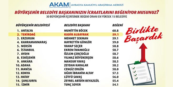 Yaptığı hizmet ve yatırımlarla Tekirdağlı vatandaşların güvenini kazanan Tekirdağ Büyükşehir Belediye Başkanı Kadir Albayrak, Avrasya Kamuoyu Araştırma Merkezi tarafından en son yapılan `Başarılı Belediye Başkanları` anketinde önemli bir başarıya imza atarak, 30 büyükşehir belediye başkanı arasında 2`nci sırada yer aldı.