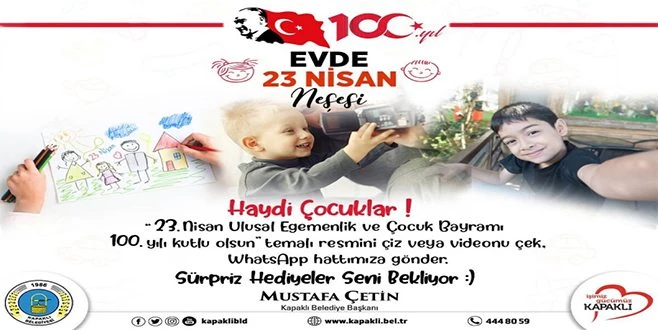 Kapaklı Belediyesi, Türkiye Büyük Millet Meclisi?nin açılışının 100?üncü yıl dönümünde, Gazi Mustafa Kemal Atatürk?ün tüm dünya çocuklarına armağan ettiği 23 Nisan Ulusal Egemenlik ve Çocuk Bayramı etkinliklerini dijital ortama taşıdı. Kovid-19 salgını nedeniyle bu yıl evlerden coşkuyla kutlanacak 23 Nisan Ulusal Egemenlik ve Çocuk Bayramı dolayısıyla `Evde 23 Nisan Neşesi` konulu etkinlik başlatıldı.