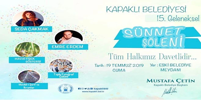 Kapaklı Belediye Başkanı Mustafa Çetin sünnet şöleni ile ilgili yaptığı açıklamada; ??Bizim örf ve adetlerimize yerleşmiş bir inancımızın gereğini yerine getiriyoruz. Bu yıl sünnet olmak için belediyemize müracaat eden çocuklarımızın Kapaklı Devlet hastanemizde sağlıklı ve hijyenik ortamlarda sünnetlerini gerçekleştirdik. Bu süreçte emeği geçen başta belediye personelimiz olmak üzere bizlere her zaman destek olan doktorlarımız ve kıymetli sağlık personelimize ayrıca teşekkür ediyorum. Çocuklarımızın ve sünnet ailelerimizin heyecanına Kapaklı halkımızla birlikte ortak olacağız. Sünnet Şölenimiz 19 Temmuz Cuma günü saat 15.00 `da Toplu Fotoğraf Çekimi 17.30?da Recep Güven Parkı?nda Mevlidi Şerif i, 18.30?da sünnet çocuklarımıza konvoy ve saat 20.30?da Eski Belediye Meydanı?nda gerçekleşecek olan kına, konserler ve havai fişek gösterileriyle tamamlanacak. Ailelerimizin bu anlamlı gününde yanında olmaya ve çocuklarımızın heyecanlarını birlikte paylaşmak için tüm halkımızı sünnet şölenimize davet ediyorum?. dedi.