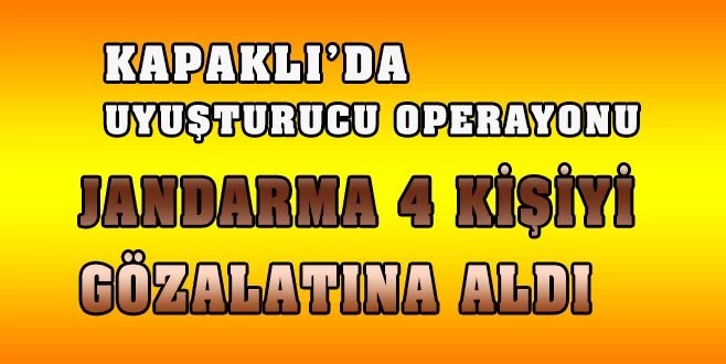 Kapaklı ilçesi Yanıkağıl Mahallesi?nde operasyon gerçekleştiren Kapaklı İlçe Jandarma Komutanlığı ekipleri, mahalle meydanında bir aracı durdurdu. Araçta yapılan aramada bir miktar bonzai adlı uyuşturucu madde ve ruhsatsız silah ele geçirildi. Operasyonda U.H., S.K., V.Y. ve Ş.K. isimli 4 zanlı gözaltına alındı.