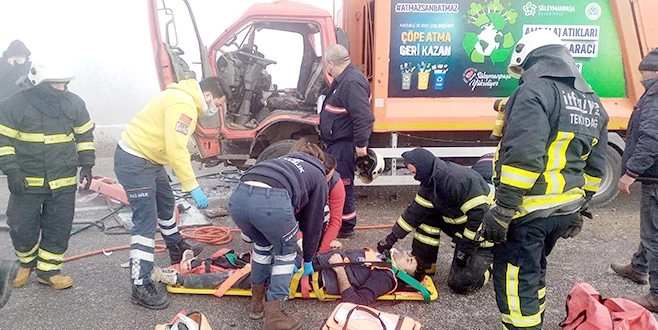 Tekirdağ?ın Malkara ilçesinde görüş mesafesinin 20 metreye kadar düştüğü yolda çok sayıda aracın birbirine girdiği kazada 1?i ağır 2 kişi yaralandı. Sıkıştığı çöp kamyonunda ?Canım çok acıyor, çıkarın beni bu kamyondan" diye bağıran temizlik işçisi, itfaiye ve sağlık ekiplerinin yoğun çabası sonrası kurtarıldı.