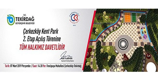 Çerkezköy`de Kent Park 2. Etap çalışmaları tamamlandığını belirten Belediye Başkanı Vahap Akay, 7 Mart Perşembe günü (Yarın) saat 14.30?da gerçekleştirilecek olan açılış törenine tüm vatandaşları davet etti.