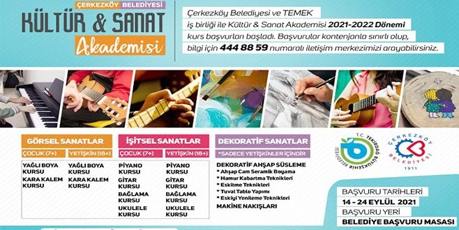 Çerkezköy Belediyesi?nin 2021-2022 Eğitim ve Öğretim Yılı içerisinde düzenleyeceği Kültür ve Sanat Akademisi Kurslarının kayıtları 14-24 Eylül tarihleri arasında Çerkezköy Belediyesi İletişim Merkezi Başvuru Masalarına yapılabilecek.