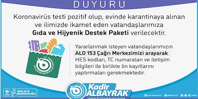 Kamuya açık alanları düzenli olarak dezenfekte eden ve ücretsiz maske dağıtımı gerçekleştiren Tekirdağ Büyükşehir Belediyesi, Kovid-19 testleri pozitif olup evlerinde karantinaya alınan vatandaşlara gıda ve hijyenik destek paketi yardımı hizmetini hayata geçiriyor. Bu kapsamda Tekirdağ ili genelinde evlerinde karantinaya alınan vatandaşlara gıda ve hijyenik destek paketlerinin yer aldığı yardım kolileri Tekirdağ Büyükşehir Belediyesi sosyal yardım görevlileri tarafından adreslerine götürülerek teslim edilecek. Gıda ve hijyen destek paketi yardımından yararlanmak isteyen vatandaşlar Tekirdağ Büyükşehir Belediyesi ALO 153 Çağrı Merkezini arayarak ya da e-Devlet üzerinden HES kodları, TC kimlik numaraları ve iletişim bilgileri ile birlikte ön kayıtlarını yaptırarak başvurularını gerçekleştirebilirler.