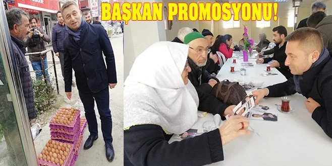 Otobüs durağının hemen yanı başına açtığı tezgahta yumurta satan vatandaş, Kozuva ve ekibini görünce yumurtalarda indirime gitti. "Başkan için promosyonlu yumurta" diyen satıcı indirimli 50 kuruşa yumurtanın tanesini yoldan geçenlere verdi.