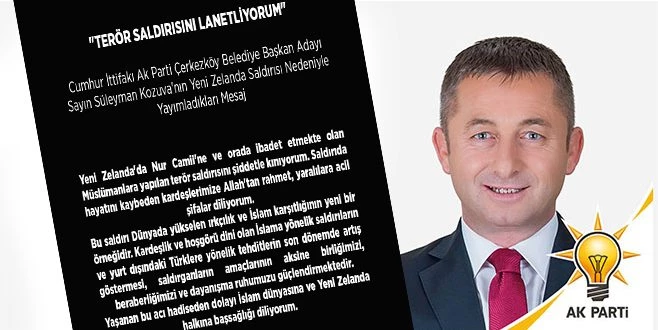 Yeni Zelanda da yaşanan terör olayının ardından Cumhur İttifakı Çerkezköy Belediye Başkan Adayı Süleyman Kozuva bir başsağlığı ve kınama mesajı yayınladı. Belediye Başkan Adayı Süleyman Kozuva, yaptığı açıklamada, "Yeni Zelanda`da Nur Camii`ne ve orada ibadet etmekte olan Müslümanlara yapılan terör saldırısını şiddetle kınıyorum. Saldırıda hayatını kaybeden kardeşlerimize Allah`tan rahmet, yaralılara acil şifalar diliyorum."dedi.
