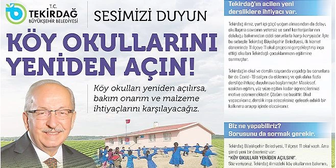Tekirdağ Büyükşehir Belediyesi, 11 ilçeye 11 okul yaptı. Ama şimdi yeni bir önerimiz var: ?KÖY OKULLARI YENİDEN AÇILSIN!?. Söz veriyoruz, Tekirdağ ilimizdeki köy okullarının bakımını, onarımını gerekirse malzeme ve donanım ihtiyacını karşılamaya elimizden geldiği kadar hazırız. Yeter ki evladımız evine en yakın yerde güvenli, huzurlu ve kaliteli bir eğitim alsın. Bu okullara atanacak öğretmenlerle, atanamayan öğretmenimiz de kalmaz. Hem aş hem gelecek yaratalım.