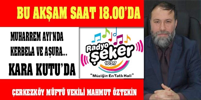 `Aşura` günün bir `Kutluma` günü olarak görülmesini kabul etmeyen Çerkezköy Ehlibeyt Dergahı Derneği Başkanı Seyyid Sinan Boztepe, 15 Eylül`deki programda uzun uzun Kerbela olayını anlatmış, soruları yanıtlamıştı. Bu akşam (Cuma) saat 18.00`da Radyo Şeker`de yayınlanacak Kara Kutu programının konuğu olacak Müftü Vekili Mahmut Öztekin aynı konuyu anlatacak.