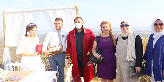 Tekirdağ?ın Süleymanpaşa ilçesinde bir çift, mor lavanta tarlasında hayatlarını birleştirdi. Tarlada nikahı kıyan belediye başkanının esprili sorusu ise herkesi gülümsetti.