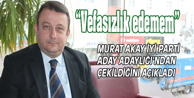 İYİ Parti?de son dönemlerde yaşanan gelişmelerin ardından eski İlçe Başkanı Cemalettin Turlin?e yakın isim olan Murat Akay, Belediye Başkan Aday Adaylığı?ndan vazgeçtiğini, ancak partisinden istifa etmediğini söyledi.