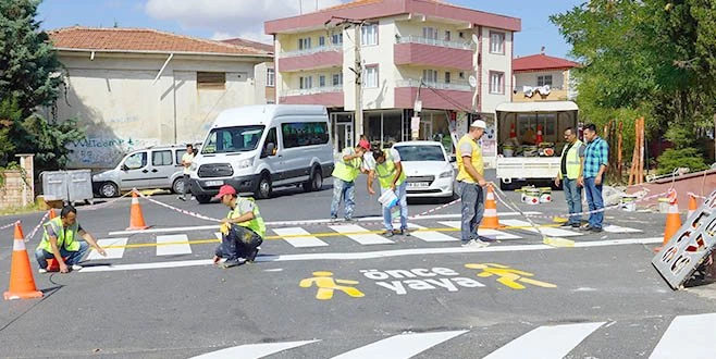 Çalışmalar kapsamında `Önce Yaya` yazılı yol işaretlemeleri tüm yaya geçitlerinde uygulanırken, işaretlemeler öncelik okulların bulunduğu bölgelerde yoğunlaştırıldı.