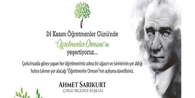 Çorlu?da görev yapan her öğretmen adına bir ağacın ve tüm öğretmenlerin isminin yer alacağı hatıra takının da bulunacağı ?Öğretmenler Ormanı?, 24 Kasım Öğretmenler Günü?nde açılıyor. Zafer Mahallesi Hâkimiyet Caddesi üzerinde yer alan ve açılışı 24 Kasım 2019 Pazar günü saat 12.00?da gerçekleştirilecek olan ?Öğretmenler Ormanı?nın açılışına tüm Çorlulular davet edildi.