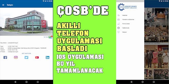ÇOSB Bölge Müdürlüğü Bilgi Teknolojileri Müdürlüğü ekibi tarafından akıllı telefon uygulaması geliştirildi. Bu uygulamayla öncelikli olarak android işletim sistemindeki akıllı telefon kullanan kişiler uygulama kapsamında hizmetlerimize ulaşabilecekler. Değişen zamana uyum sağlayan ve yüzünü geleceğe çeviren ÇOSB, mobil uygulamasıyla da dünyaya açılarak yeni iletişim yolları ile kaliteli hizmetlerine devam edecek.