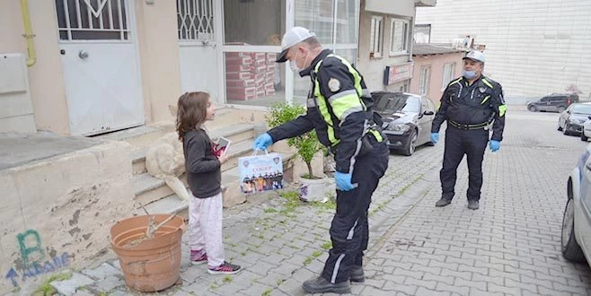 Trafik Haftası kapsamında Tekirdağ İl Emniyet Müdürlüğü Trafik Şubeye bağlı polis ekipleri kapı kapı dolaşıp korona virüs nedeniyle evden çıkamayan çocuklara hediye dağıttı.