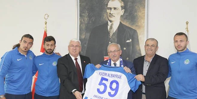 Ergene Belediye Başkanı Rasim Yüksel ve Ergene Velimeşespor takımının futbolcu ve yöneticileri günün anısına Başkan Albayrak`a Ergene Velimeşespor atkısı ve isminin yazılı olduğu formayı hediye etti.