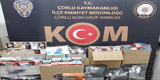 Tekirdağ İl Emniyet Müdürlüğü Kaçakçılık Organize Suçlarla Mücadele Şube Çorlu KOM Amirliği ekiplerince kaçak tütün ve tütün ürünlerine yönelik eş zamanlı operasyon düzenlendi. Operasyon kapsamında 1 araç ve 9 işyerinde arama yapıldı. Aramalarda 47 bin 140 adet doldurulmuş makaron, 40 bin 180 boş makaron, 48 kilogram paket halinde kıyılmış tütün, 60 adet 50 gramlık nargile tütünü, 11 adet 500 gramlık nargile tütünü, 6 adet mükerrer kullanılmak üzere bandrol ele geçirildi.
