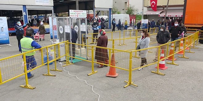 El dezenfektanlarından da kullanan vatandaşlar semt pazarı içerisinde yoğunluk oluşturdu.