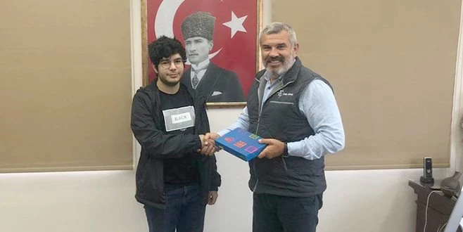 Hayırsever iş insanı Ahmet Çetin, başarılı öğrenci Onur Yüksel?e hediye vermeyi de ihmal etmedi.