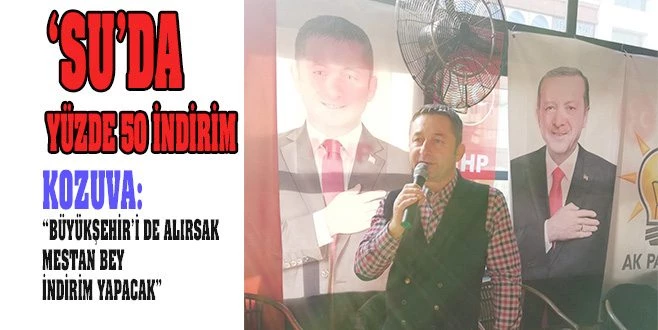 BUGÜN sabah 10.00`da `Cumhur İttifakı`nı oluşturan MHP ve AK Parti teşkilatlarının ortaklaşa düzenlediği programda konuşan Belediye Başkan Adayı Süleyman Kozuva, Büyükşehir Belediye Başkan Adayı Mestan Özcan`a da destek istedi. Su fiyatlarının yüksekliğinden yakınan sorular üzerine konuşan Başkan Adayı Kozuva, "Suyu 9 TL`ye kullanıyoruz. Bir de iki ayda bir okuyorlar. Bu haksızlıklar giderilecek. Sizden Büyükşehir Belediyesi`ne de destek istiyorum. Büyükşehir`i de almamız lazım. O zaman yüzde 50`ye varan bir indirim yapılacak."ifadelerini kullandı.