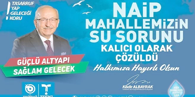 Süleymanpaşa ilçesine bağlı Naip Mahallesi?nde özellikle yaz aylarında yaşanan su sorunu, Tekirdağ Büyükşehir Belediyesi ve bağlı kuruluşu TESKİ?nin titizlikle sürdürdüğü çalışmalar sonucunda kalıcı olarak çözüme kavuşturuldu.