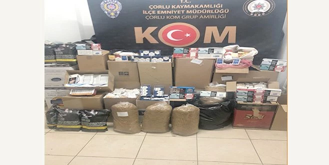 Tekirdağ İl Emniyet Müdürlüğü Çorlu KOM Grup Amirliğince kaçakçılık suçlarıyla mücadele kapsamında Çerkezköy ve Kapaklı ilçelerinde 9 işyerine operasyon düzenlendi. Operasyon kapsamında işyerlerinde yapılan aramalarda, 121 bin 600 adet içi tütüne doldurulmuş makaron, 134.4 kilogram açık kıyılmış tütün, 7.5 kilogram nargile tütünü, 3 bin 500 adet bandrolsüz sigara sarma kağıdı, 87 adet mükerrer kullanıldığı değerlendirilen TAPDK bandrollü ele geçirildi. Operasyonda toplamda 9 şüpheli şahıs yakalandı.