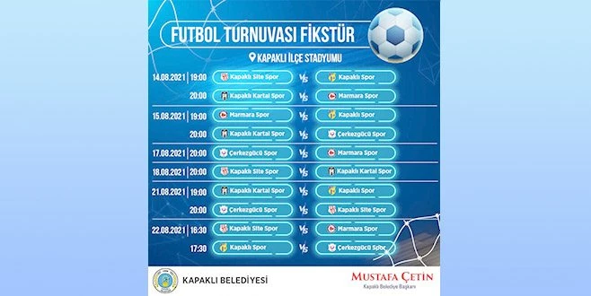 Kapaklı Belediyesi Gençlik ve Spor Hizmetleri Müdürlüğü tarafından U-14 Futbol Turnuvası düzenlenecek. Turnuvaya ilçemizden Kapaklıspor, Kapaklı Sitespor ve Kapaklı Kartalspor takımları ile Çerkezköy ilçesinden Çerkezgücüspor, Saray ilçesinden Marmaraspor takımları katılacak.