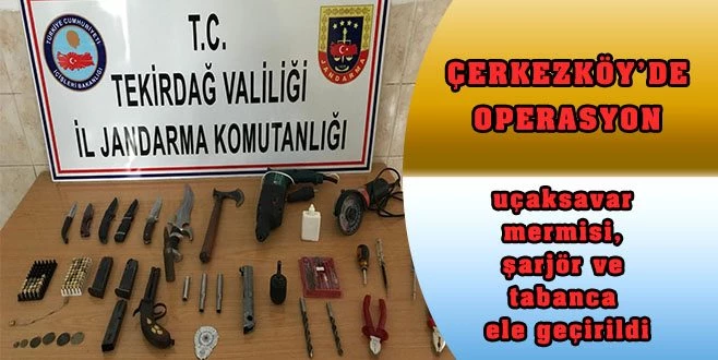 Tekirdağ?ın Çerkezköy ilçesinde bir eve düzenlenen operasyonda uçaksavar mermisi, şarjör ve tabanca ele geçirildi.