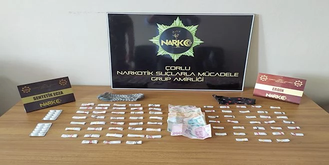 Tekirdağ İl Emniyet Müdürlüğü Narkotik Suçlarla Mücadele Şube Çorlu Grup Amirliği ekiplerince ilçeye bağlı Hıdırağa Mahallesi`nde tespit edilen adrese operasyon düzenlendi. Yapılan aramalarda, 71 fişek halinde uyuşturucu maddelerden eroin maddesi, 20 adet kırmızı reçeteye tabi sentetik ecza (hap), uyuşturucu madde ticaretinden elde edildiği değerlendirilen 845 TL para ele geçiril ikamet sahibi Y.T. ve ikamette bulunan F.C. yakalanarak, gözaltına alındı. Şahıslar hakkında uyuşturucu madde ticareti suçundan gerekli yasal işlemlere başlatıldı.