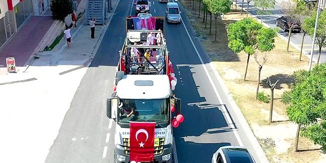 Zafer TIR`ını ve Belediye Başkanı Vahap Akay?ı gören vatandaşlar evlerinin balkonlarına ve pencerelerine çıkıp, ellerindeki ay yıldızlı bayrakları sallayıp, çalan marşlara coşku ile eşlik ettiler.