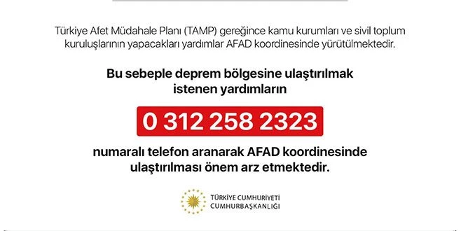 Tekirdağ Valiliği`nden yapılan duyuruda, Türkiye Afet Müdahale Planı (TAMP) gereğince kamu kurumları ve sivil toplum kuruluşlarının yapacakları yardımların AFAD koordinesinde yürütüldüğü belirtilerek, Elazığ`da yaşanan deprem nedeniyle bölgeye yapılacak yardımların 0 312 258 23 23 numaralı telefon aranarak AFAD koordinesinde ulaştırılması istendi.