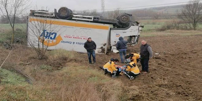 Olay, saat 11.45?te Muratlı-Tekirdağ karayolu 4. Km?de meydana geldi. Edinilen bilgiye göre; Süleymanpaşa?dan Muratlı yönüne doğru seyir eden bir lojistik firmasına ait atık toplama aracı, sürücüsünün bir anlık dikkatsizliği neticesinde kaygan zeminin de tesiriyle yoldan çıkarak tarlaya uçtu. Olay yerine gelen ambulansla henüz kimliği öğrenilemeyen sürücü hastaneye kaldırıldı. Emniyet Trafik ve Jandarma Trafik ekipleri kaza mahalline gelerek inceleme başlattı. Ters dönen ticari kamyonun tarladan çıkarılması için kurtarıcı çağrıldı.