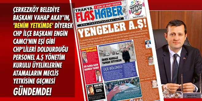 Geçtiğimiz ay içinde Ticaret Bakanlığı tarafından Ticaret?Sicil Müdürlükleri?ne gönderilen bir genelge,?akla Çerkezköy?Belediye Başkanı Vahap?Akay?ın, Belediye Personel A.Ş Yönetim Kurulu üyeliklerine yaptığı atamaları getirdi. Başkan Akay, CHP?li İlçe Başkanı Engin Camcı`nın eşi İlknur Camcı`yı yönetim kurulu başkanı, CHP eski İlçe Başkanı Birol Öztürk ve Candan Dönmez`i yönetim kurulu üyesi olarak Çerkezköy Belediyesi Personel A.Ş`ye atamıştı. Bakanlık genelgesi uygulamaya geçerse bundan sonra Başkan Akay`ın, "Yetki bende, istediğim kişi atarım" demesi geçerli olmayacak. Atamalar, Belediye Meclisi`nin onayına sunulacak.