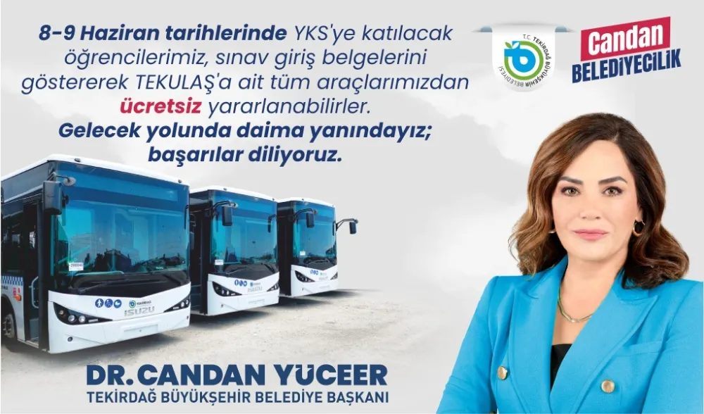 Konu ile ilgili olarak sosyal medya hesabından bir açıklama yayımlayan Tekirdağ Büyükşehir Belediye Başkanı Candan Yüceer, “Ülkemizin geleceği olan değerli evlatlarım; bu hafta sonu gireceğiniz Yükseköğretim Kurumları Sınavı nedeniyle, sınav giriş belgenizi göstererek TEKULAŞ’a bağlı tüm otobüslerimizden ücretsiz olarak yararlanabilirsiniz. Unutmayın ki, sonuç ne olursa olsun sizlerden daha kıymetli değil. Sizleri, hayalinizdeki geleceğe taşımak için daima buradayız. Her birinize başarılar diliyor, gözlerinizden öpüyorum” ifadelerini kullandı.