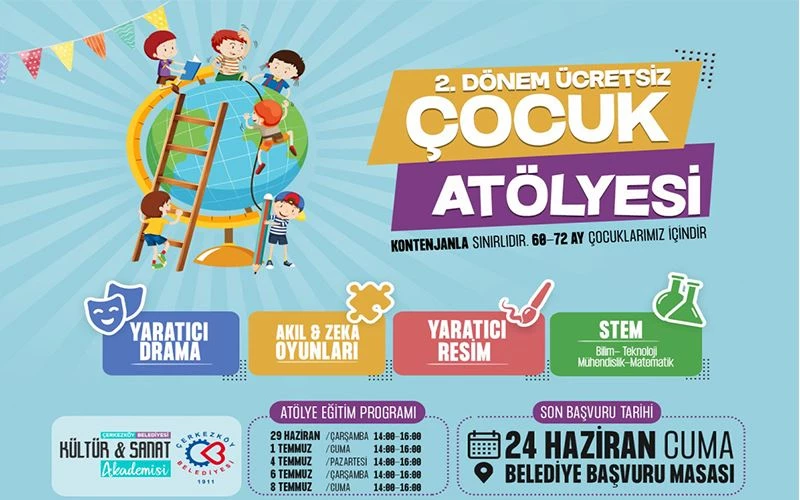 Çerkezköy Belediyesi Çocuk Atölyesi’nin 2. Dönem başvuruların başladığını ve 24 Haziran Cuma günü sona ereceğini belirten Çerkezköy Belediye Başkanı Vahap Akay, “Atatürk Kültür Merkezimizde 60-72 ay aralığındaki çocuklarımız için açacağımız Çocuk Atölyemizde Yaratıcı Drama, Akıl ve Zeka Oyunları, Yaratıcı Resim ile STEM (Bilim, Teknoloji, Matematik ve Mühendislik) branşlarında ücretsiz eğitim verilecek. Konusunda uzman eğitmenler tarafından verilecek kurslarımıza çocuklarını kayıt ettirmek isteyen vatandaşlarımız 24 Haziran Cuma gününe kadar bir adet vesikalık fotoğraf ve kimlik fotokopisi ile birlikte Çerkezköy Belediyesi İletişim Merkezi Başvuru Masalarına kayıtlarını yaptırabilirler” dedi.