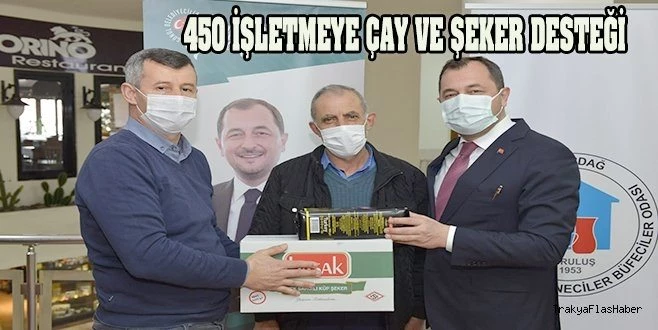 Tekirdağ Kahveciler, Kıraathaneciler ve Büfeciler Odası Başkanı Fahrettin Bayar?ı ziyaret eden Süleymanpaşa Belediye Başkanı Cüneyt Yüksel, odaya bağlı yaklaşık 450 kahvehane ve çay ocağına, işletme başına 6 kilogram çay ve 4 kilogram sargılı küp şekerden oluşan destek paketini sembolik olarak takdim etti.