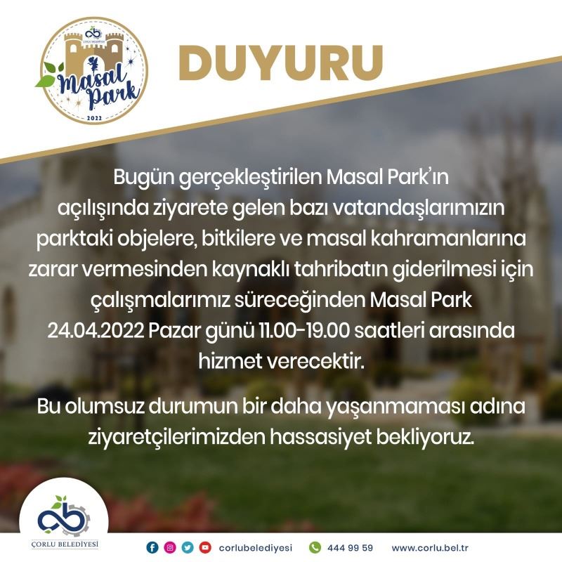Konuya ilişkin olarak Çorlu Belediyesi’nin resmi sosyal medya hesaplarından yapılan duyuruda önce, “Bugün gerçekleştirilen masal parkın açılışında ziyarete gelen bazı vatandaşlarımızın parktaki objelere, bitkilere ve masal kahramanlarına zarar vermesinden kaynaklı tahribatın giderilmesi için çalışmalarımız süreceğinden 11.00 - 19.00 saatleri arasında hizmet verecektir” denildi.