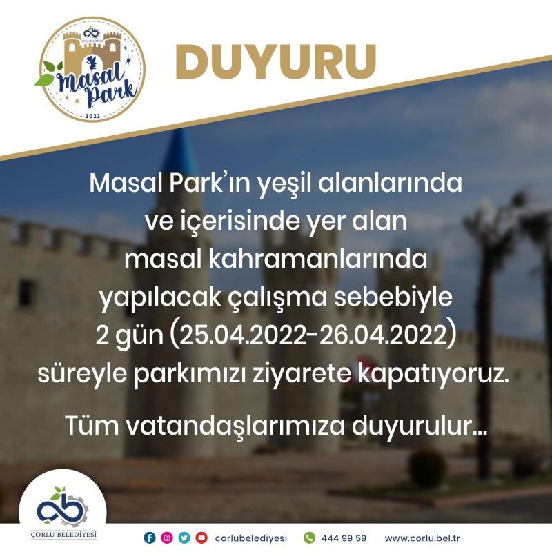 Yapılan ikinci açıklamada ise vatandaşları suçlayan ifadeler kullanmaktan vazgeçen Çorlu Belediyesi bu kez açıklamasında “Masal Park’ın yeşil alanlarında ve içerisine yer alan masal kahramanlarında yapılacak çalışma sebebiyle 2 gün süreyle parkımızı ziyarete kapatıyoruz. Tüm vatandaşlarımıza duyurulur ibarelerine yer verildi.