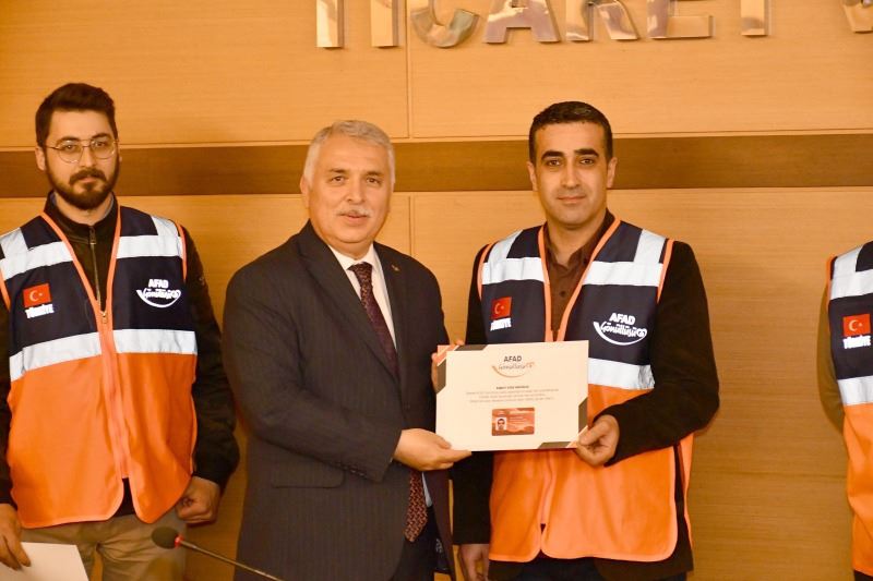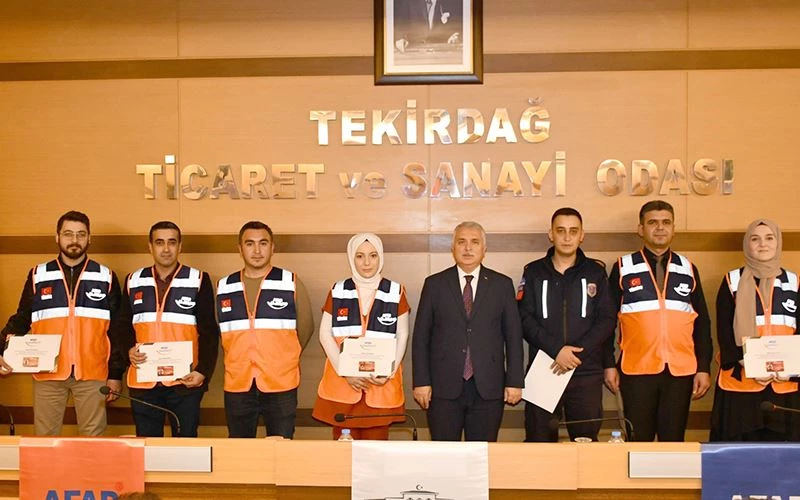 Tekirdağ Ticaret ve Sanayi Odası’nda gerçekleştirilen törene, Vali Aziz Yıldırım’ın yanı sıra Süleymanpaşa Kaymakamı Harun Kaya, İl Emniyet Müdürü Mehmet Hakan Fındık, İl Jandarma Komutanı Kıd. Alb. Osman Kılıç, AFAD İl Müdürü Recep Erol, AFAD personeli ve AFAD Gönüllüleri katıldı.
