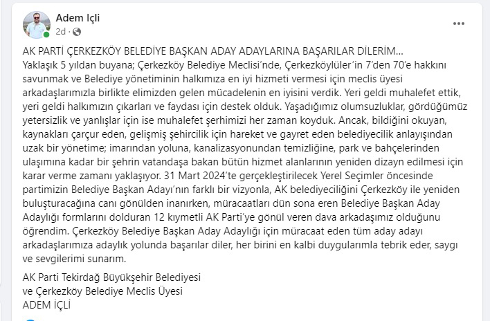Bu arada, AK Parti Tekirdağ Büyükşehir Belediyesi ve Çerkezköy Belediyesi Meclis Üyesi Adem İçli, bugün sosyal medya hesabından yaptığı bir paylaşımla tüm aday adayı olan partililerini tebrik edip, başarılar diledi. İşte adı belediye başkan aday adaylığında geçen ancak aday adaylığı için de müracaatta bulunmayan Adem İçli’nin sosyal medya hesabından yaptığı paylaşım: