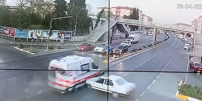 Acil yardım ambulansıyla bir otomobilin faciadan kıl payı dönülen çarpışma anı kameralara yansıdı.