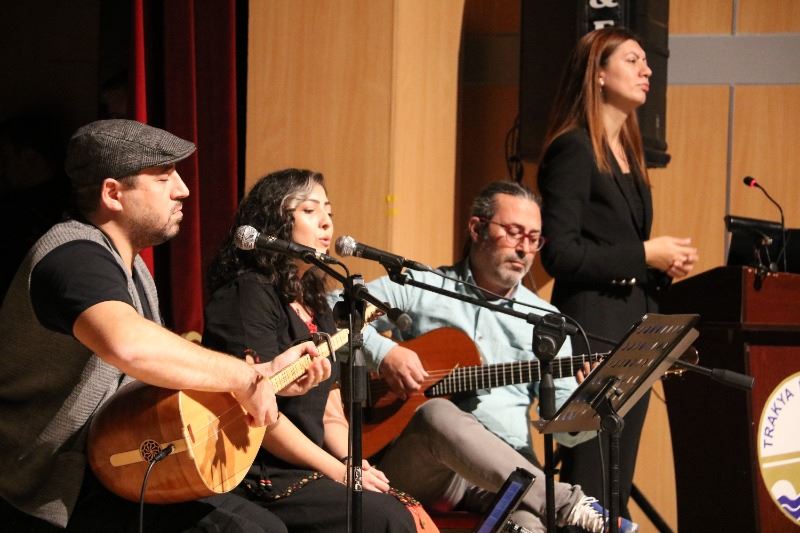Aşık Veysel denilince akla dizelerinden çok Bedri Rahmi Eyüboğlu’nun dizesi geldiğini ifade eden Trakya Üniversitesi Rektörü Prof. Dr. Erhan Tabakoğlu, Aşık Veysel’in türkülerinin büyük şairleri utandırdığı belirterek, “Şahittim, zifiri karanlıkta gelse şiirin hasını ayak seslerinden tanırım. Ne zaman bir köy türküsü duysam şairliğimden utanırım. Aşık Veysel işte böyle şairleri utandıracak, o içten gelen ama yedi kat içten gelen bu toprağın sesini, rengini ve kokusunu bize anlatan mükemmel bir şahsiyettir. Bu güzel insan, bizi anlatan insanı rahmetle, minnetle yâd ediyorum. İnşallah güzel bir gece olacak, buraya gelen herkese şükranlarımı sunuyorum” dedi.
