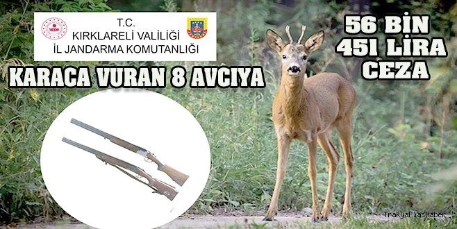 Kırklareli?nde usulsüz olarak avlandığı ve karaca vurduğu tespit edilen 8 kişiye 56 bin 451 lira cezai işlem uygulandı.